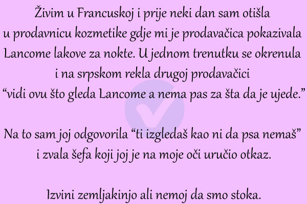 HomeInternet · Zanimljivosti ISPOVIJEST: “Vidi ovu što gleda Lancome a nema pas za šta da je ujede …” November 9, 2018 Internet, Zanimljivosti Share and Enjoy !0Shares0 0 Tweet Pin It Related Posts Internet Bez da ispadneš očajna: 5 načina da mu k... By admin Oct 10, 2016 Internet MISTERIOZNA RUPA NA ANTARKTIČKOM OSTRVU:... By admin Dec 12, 2020 Internet 7 stvarnih mjesta koja su bila inspiraci... By admin Jun 6, 2016 Leave a Reply Cancel replyYour email address will not be published. Required fields are marked *Name Email Website Save my name, email, and website in this browser for the next time I comment.